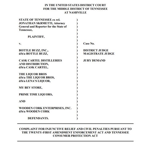 The Tennessee Attorney General last month filed a federal lawsuit to immediately stop the flow of illegal liquor shipments facilitated by six unlicensed out-of-state defendants. The lawsuit, filed in the United States District Court for the Middle District of Tennessee, seeks a preliminary and permanent injunction against defendants under the federal Twenty-First Amendment Enforcement Act, 27 U.S.C. 122a, as well as civil penalties pursuant to the Tennessee Consumer Protection Act, Tenn. Code § 47-18-108(a)(1).