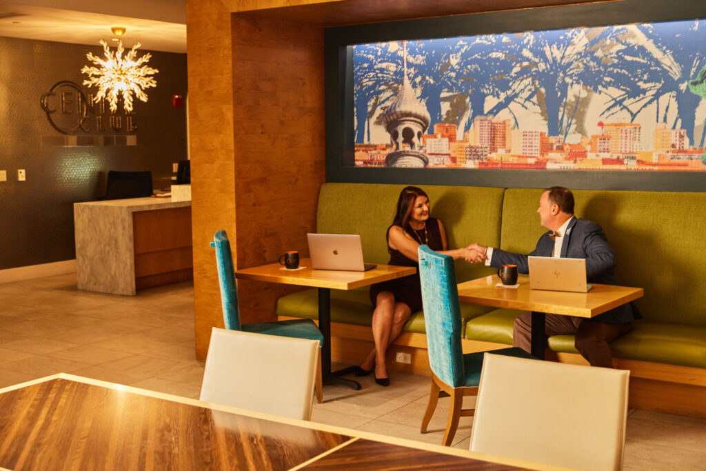 “Within our members-only space at Centre Club is our co-working space, Productivity. Then you move into the bar and restaurant area, Origins. We also have three Touchdown, or breakout rooms, that people can work out of. We have three main boardrooms that also serve as private event Rooms. The largest boardroom is our Ybor Room and then we have two smaller rooms – our Gallery Room and Urban Room. We also have a large ballroom that can accommodate about 220 people for seated events and about 300 people non-seated. Our members don’t have to pay a room rental fee, which provides a huge benefit.”