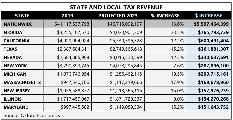 AHLA designated Florida, California, Texas, Nevada, New York, Michigan, Massachusetts, New Jersey, Illinois, and Maryland as the top ten leaders in hotel-generated state and local tax revenue from 2019 to 2023. You can see a breakdown of their projections below.