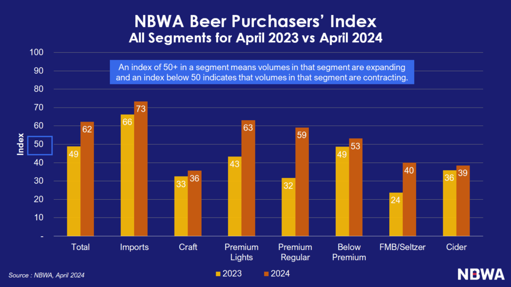 Summer is approaching, and beer purchasing activity is still on an incline, according to the National Beer Wholesalers Association’s (NBWA) April 2024 Beer Purchasers’ Index (BPI). The April BPI reading – 61 – is the highest reading, and first at 60 or higher, since December 2021. A BPI reading of 50+ indicates that purchasing volumes are expanding in that segment, while a reading of below 50 shows that volumes in that segment are contracting.